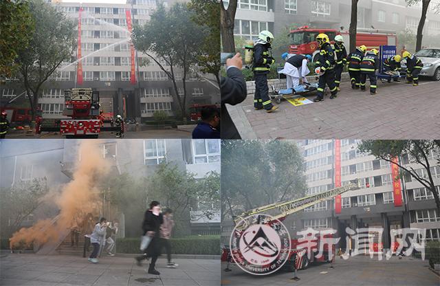 15时整,随着总指挥田红芳副书记一声命令,悦斋公寓C区605室燃起烟雾,接到火警后,各级值班人员按照学校消防控制室火灾处置流程及时正确进行了处置。微型消防站3分钟内赶到火灾现场,利用现有装备器材第一时间控制住“火势”蔓沿;各楼层安全员根据灭火疏散救援演习方案分工,快速有序疏散楼内人员。随后伴着刺耳的警报声消防车快速到达战斗位置,消防队员迅速展开灭火救援行动,排烟机在B区北侧疏散门内侧迅速排烟,云梯车迅速展开救援被困人员;医护人员对被救出受伤人员实施现场救护;消防队员用高压水枪和楼内消火栓出水灭火;2000余名学生在各疏散小组引导下,用毛巾、口罩捂住口鼻、相互搀扶从七个紧急安全出口安全疏散,迅速撤离到安全地带。消防官兵、工作人员明确任务、坚守岗位、执行到位,同学们听从指挥、反应迅速、行动有序,保障了演习活动的顺利进行。
