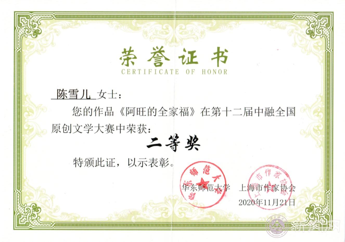 中融全国原创文学大赛是全国性的原创文学赛事,本次比赛设置一等奖1名、二等奖2名、三等奖3名,共收到来自26个省市的文学作品两千余篇。陈雪儿在董树宝教授的悉心指导下确定选题,反复打磨参赛作品,数易其稿,经过激烈角逐和三轮严格审核,最终获得二等奖。
