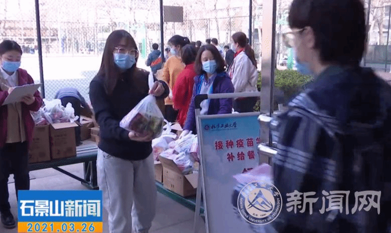 作为一所对学生最好的大学,在疫苗接种过程中,学校为参加接种的学生提供了全方位、全流程的贴心服务,从排队引导、扫码测温、填表咨询、信息录入、疫苗接种、留观服务等各个环节,都充满了人文关怀。文法学院中文18-2班张震同学表示:“在学校疫苗接种现场,我深深地感受到我们的党身为一个百年大党坚持不忘初心的为民情怀,这是党的领导的伟大胜利、是中国特色社会主义制度优势的显著体现。”学工部在每个环节安排了工作人员,确保接种协调顺畅、安全有序;校团委组织了300多人次学生志愿者参与全程的服务保障,协助接种引导、留观服务等。经管学院管17-2班于润泽同学在接受石景山电视台采访时表示:“做志愿者很光荣,也很有意义。虽然很辛苦,但我们甜在心里。能够亲眼见证同学们接种疫苗后的自信和坚定,感受到学校的亲切关怀,我们倍感振奋!”学生工作部还专门为前来参加疫苗接种的每一名学生准备了爱心餐包,为同学们在接种疫苗后及时补充能量。电控学院电气20-2班吴嘉骏同学表示:“接种疫苗的整个过程中给我留下最深的印象就是井然有序,暖心关爱,学校还为每位接种疫苗的同学准备了爱心餐包。”