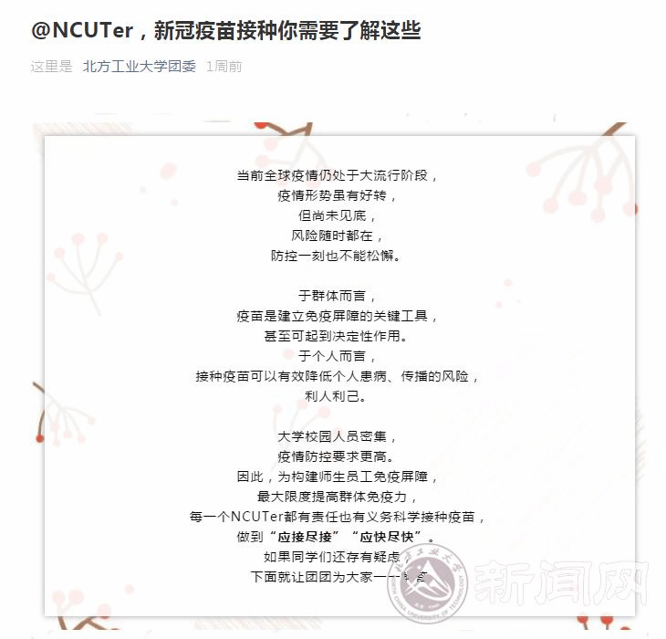开展新冠疫苗接种,构筑科学防疫屏障,是阻断新冠疫情传播的有效途径。为了提高疫苗接种率,学校高度重视本次疫苗接种工作,在学校党委的统一领导下、防疫办的统筹部署下,学生工作部门精心制定了学生参与疫苗接种的工作方案,在组织动员、时间安排、流程管理、服务保障等各个方面下足功夫,确保学生接种工作顺利进行。接种前,在信息中心的大力支持下,采用企业微信开展了接种摸底调查,精准掌握了同学们的接种意愿。随后,学校推出多期宣传科学接种疫苗的文章,向同学们普及新冠疫苗及科学接种有关知识,动员同学们积极行动起来,主动接种疫苗。各学院按照学校的统一部署,精心组织实施,辅导员、班导师与学生开展一对一的联络沟通,精准动员符合接种条件的学生积极参加接种,对于不符合接种条件的学生也做到心中有数、给予关心。经过全校上下的共同努力,学生们主动接种、踊跃接种的意愿强烈,校园里形成了一股人人参与接种、共筑健康长城的良好氛围。