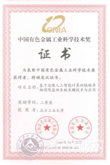 近日,中国有色金属工业协会、中国有色金属学会公布了2020年度中国有色金属工业科学技术奖授奖项目,世界杯作为第一完成单位申报的“基于边缘人工智能计算的铁路异物侵限监测系统关键技术与应用”项目获得二等奖。