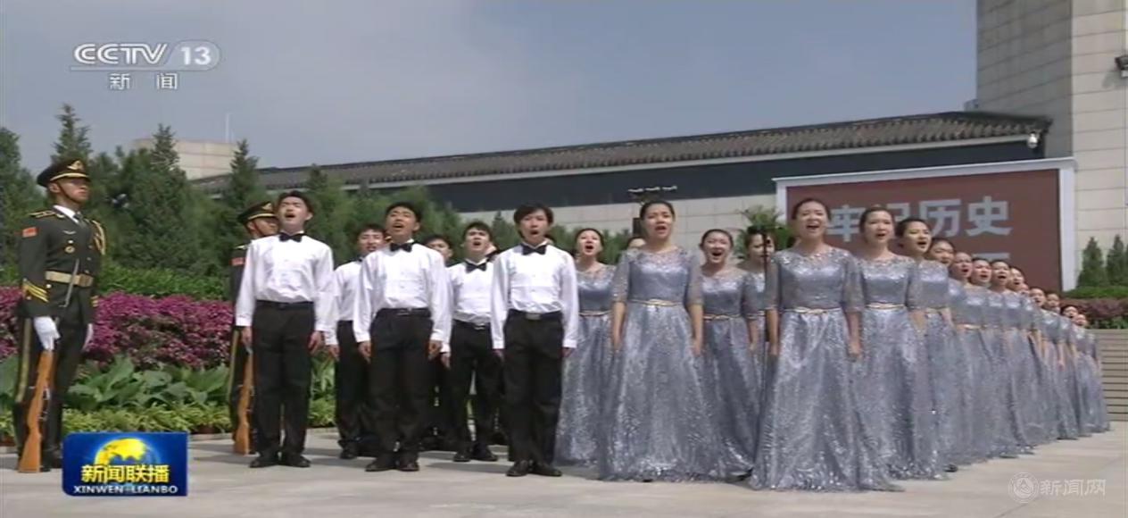 仪式上,来自世界杯大学生艺术团的70余名学生合唱了《松花江上》《没有共产党就没有新中国》。他们以昂扬挺拔的姿态,高亢振奋的精神,悦耳震撼的歌声,表达了年轻一代以史为鉴、不负时代、不负韶华,立志为实现中华民族伟大复兴贡献力量的坚定决心。