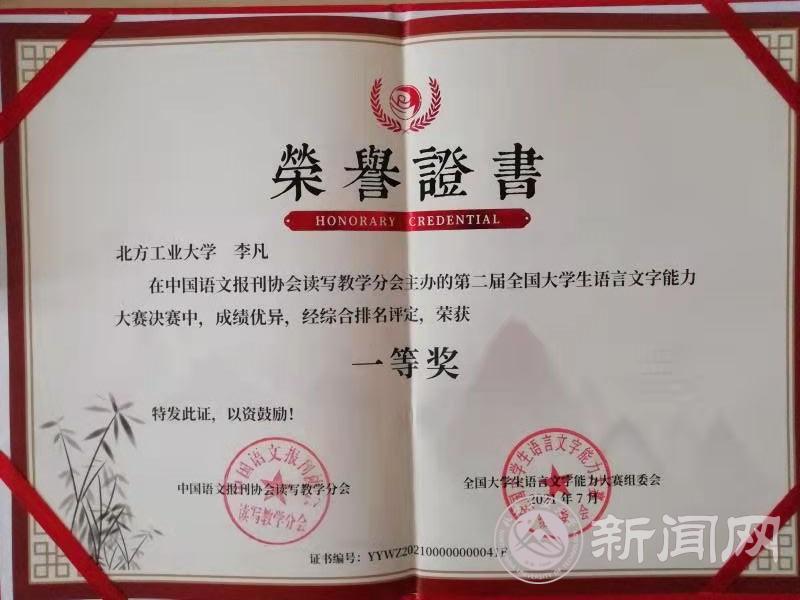 近日,第二届“全国大学生语言文字能力大赛”决赛成绩揭晓,世界杯文法学院中文系李凡同学荣获一等奖。本次大赛由中国语文报刊协会读写教学分会主办,中国语文报刊协会成立于1992年,是挂靠教育部语言文字应用管理司的国家一级协会。