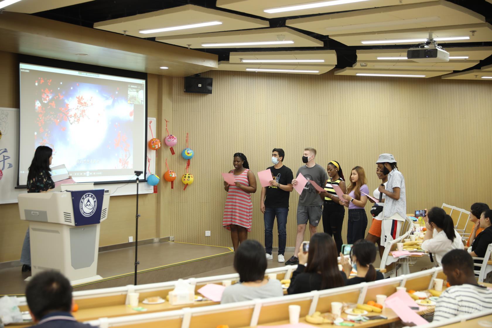 诗会分为“史话中秋”“望月怀古”和“睹月思乡”等三个部分。国院学院的十多位教师为留学生生动讲解了中秋节的来历、传统美食、各类民俗活动以及和中秋有关的神话传说,让同学们了解了中秋节的风俗习惯,感受到了传统节日所蕴含的深厚文化。师生一起朗读吟唱与中秋节有关的唐诗、宋词、现代诗歌和歌曲,更深刻地感受到了中秋节寄托人们对合家团圆、思乡思亲、期盼丰收的情感。整个活动充满浓厚的传统节日气氛,展现出中国传统节日的文化内涵。