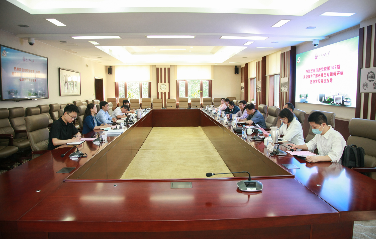 调研组认真听取学校纪委的汇报,并就市属高校纪检监察体制改革后,学校纪检监察机关履行党内监督、国家监察专责过程中面临的困难和问题,特别是聚焦纪检监察业务工作中信访举报、监督检查、审查调查、案件管理、纪法衔接、法法贯通、履行监督一把手和领导班子、一体推进“三不”、学校纪检监察干部队伍建设等重点工作内容,进行了深入的研讨与交流。调研组充分肯定学校纪检监察工作取得的成效,表示此次调研收获很大。调研组还就进一步自觉践行习近平法治思想,增强法治意识,运用法治思维和法治方式正风肃纪反腐,加强工作的规范化、法治化、正规化建设,推动学校纪检监察工作高质量发展提出了中肯的指导意见。