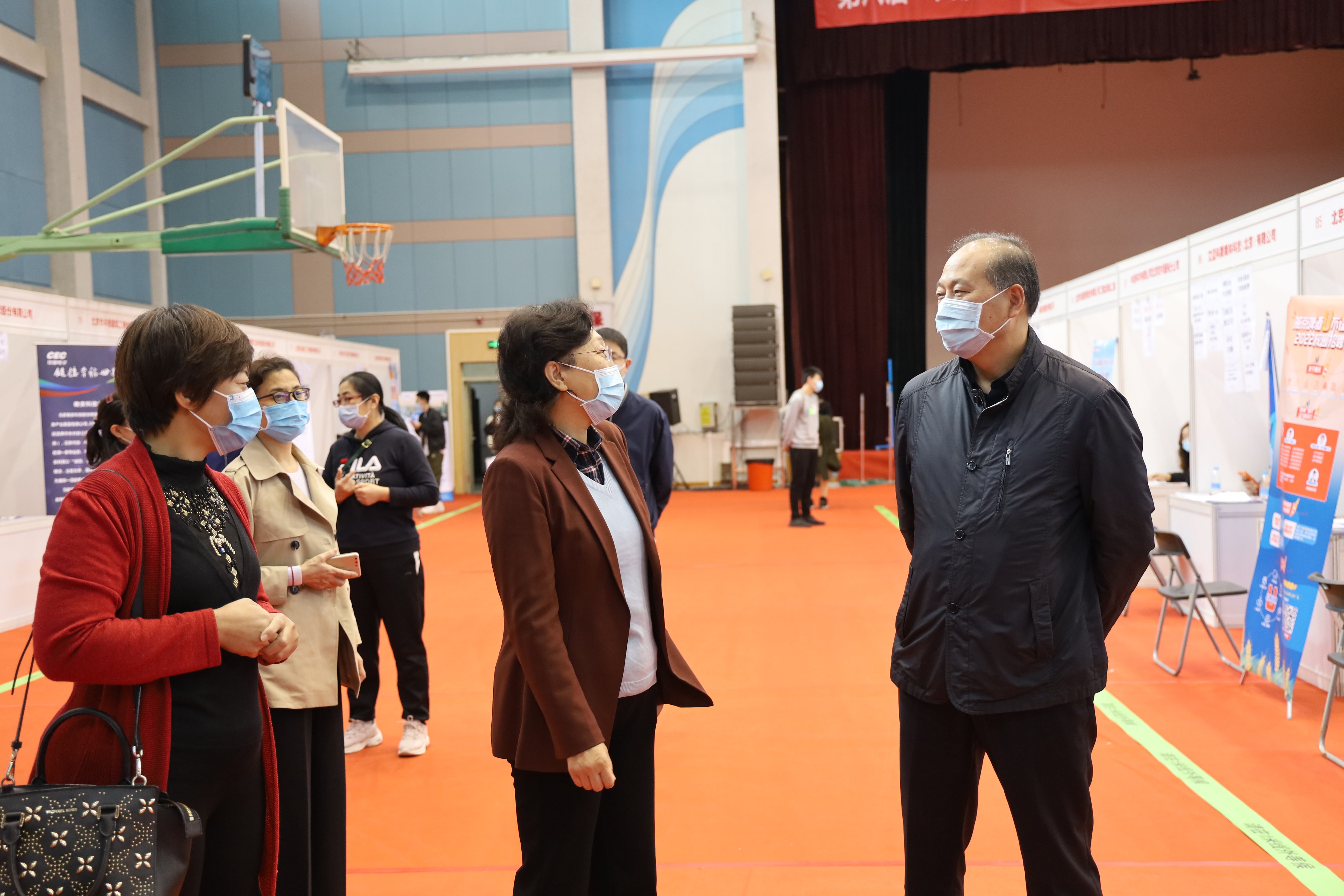 此前,匡校震一行还到世界杯体育馆大型双选会现场进行了调研,了解学校招聘会筹备和组织、毕业生应聘、就业工作开展情况,对学校做好毕业生就业服务提出了要求。本场双选会邀请了124家用人单位参加,包括中国联通、大唐移动、中国新兴、中建八局、北京城建、燕京啤酒等68家大型央企国企,以及中芯国际、京东方、宇视科技等高新技术企业,计划招聘10311人,招聘岗位覆盖了学校大部分专业。双选会现场秩序井然,工作人员通过测温验码、控制流量、加强通风等手段,严格落实疫情防控要求。毕业生携带精心准备的求职材料,积极与用人单位交流互动,寻找适合自己的工作岗位。各学院领导和辅导员在现场指导毕业生求职,并与用人单位交流。
