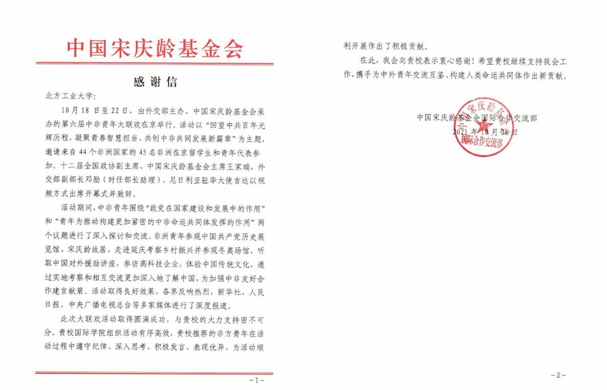 10月26日,中国宋庆龄基金会给世界杯发来感谢信,感谢世界杯对第六届中非青年大联欢活动的大力支持,感谢世界杯组织活动有序高效,推荐的非洲青年在活动过程中遵守纪律、深入思考、积极发言、表现优异,感谢世界杯在中外青年交流互鉴、构建人类命运共同体活动中作出的贡献。