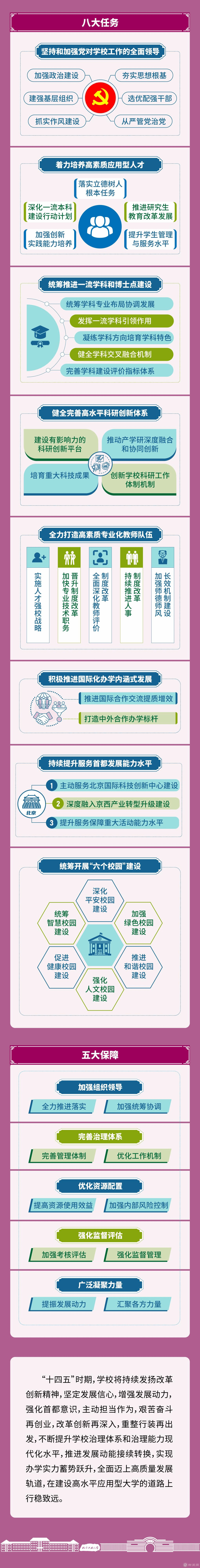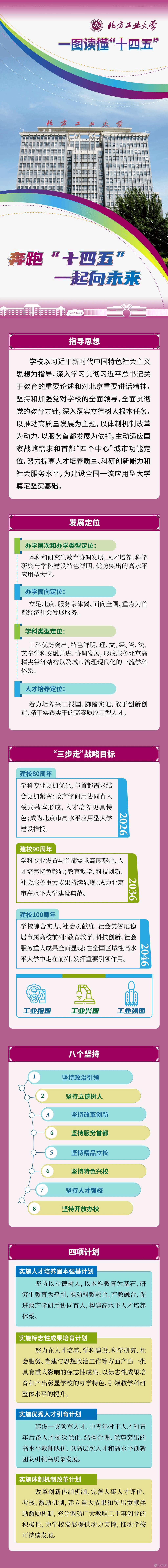面向“十四五”,学校坚持全面从严治党,落实立德树人根本任务,以推动高质量发展为主题,以改革创新为根本动力,按照《规划》明确提出的“三步走”战略目标、以“八个坚持”为核心发展思路,重点实施“四项计划”,即人才培养固本强基计划、标志性成果培育计划、优秀人才引育计划、体制机制改革计划,集中力量建设好高水平应用型大学,促进学校治理体系和治理能力现代化,为服务国家战略需求和首都“四个中心”功能建设,特别是国际科技创新中心建设提供人才保障和智力支撑。