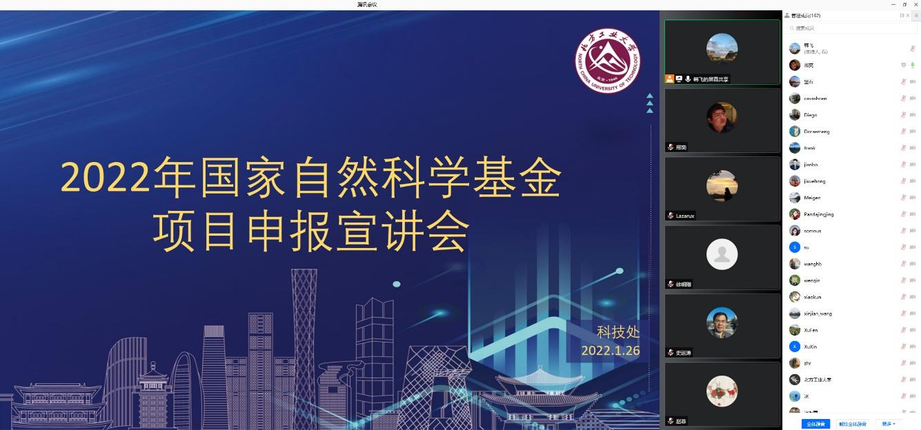 1月26日,学校召开2022年度国家自然科学基金项目申请线上宣讲会。党委常委、副校长王力参加会议并讲话,会议邀请了北京科技大学能源与环境工程学院院长、国家“万人”专家邢奕教授就国家自然科学基金项目申报相关问题进行报告,会议由科技处副处长韩飞主持。