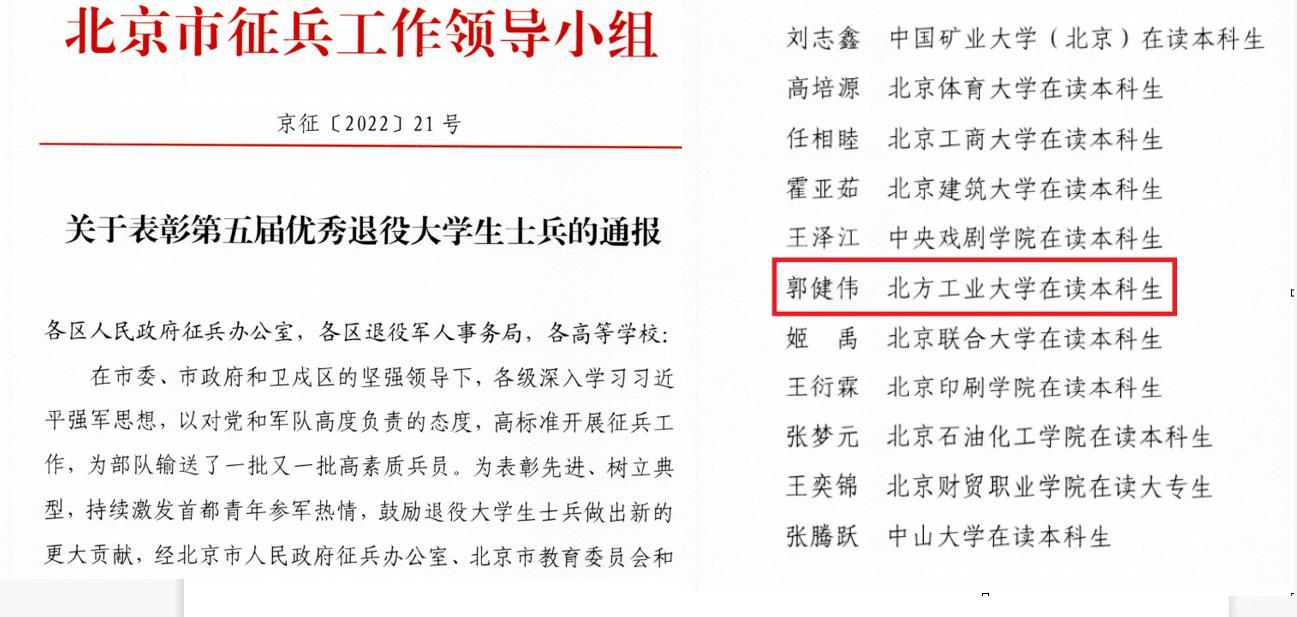 日前,由北京市征兵工作领导小组组织开展的第五届优秀退役大学生士兵评选活动落下帷幕。经过广泛发动、逐级推荐、资格审核、政治考核、现场答辩等环节,全市评选出30名优秀退役大学生士兵,世界杯2019级文法学院郭健伟同学名列其中