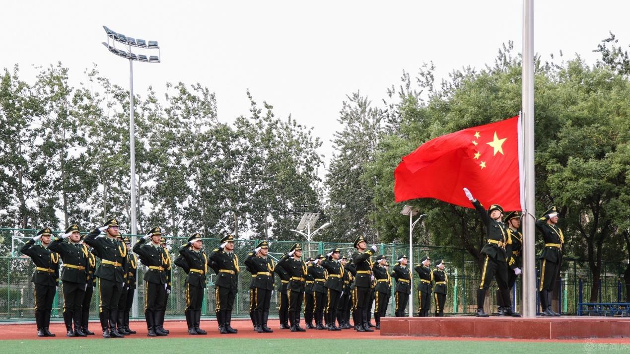 开学典礼在庄严的升国旗仪式中开始,全体师生迎着朝阳,面向国旗,肃立行礼,齐唱国歌。