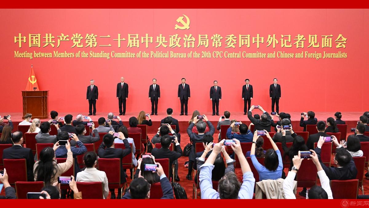 10月23日上午,在中国共产党第二十届中央委员会第一次全体会议上当选的中共中央总书记习近平和中共中央政治局常委李强、赵乐际、王沪宁、蔡奇、丁薛祥、李希在北京人民大会堂同中外记者亲切见面,习近平总书记发表重要讲话。