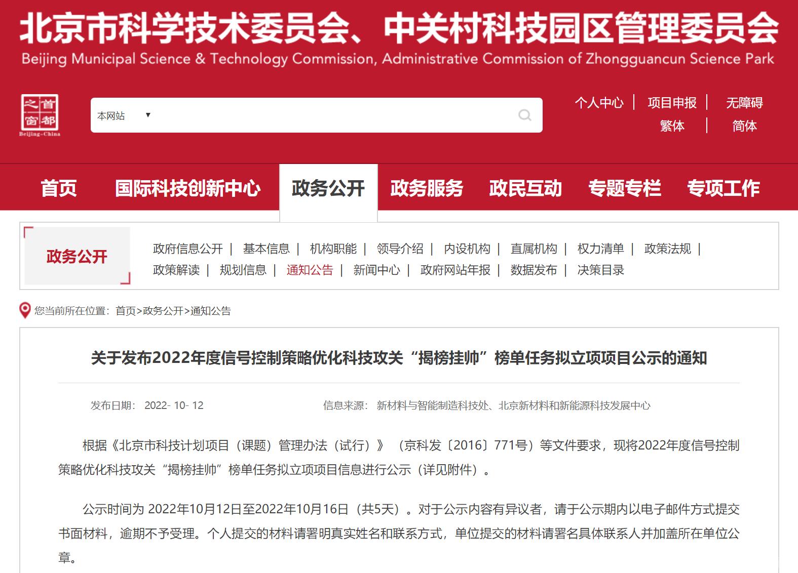 10月12日,北京市科委公示了2022年度信号控制策略优化科技攻关“揭榜挂帅”拟立项目名单,世界杯智能交通科研团队联合北京高鸿智联科技有限公司、北京百度网讯科技有限公司和智慧足迹数据科技有限公司共同申报的“智能网联数据驱动的城市交通信号控制优化关键技术及应用”项目成功入选。