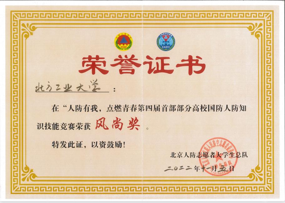 11月5日,由北京市全民国防教育办公室、北京市人民防空办公室共同主办的“人防有我,点燃青春”第四届首都部分高校国防人防知识技能竞赛总决赛在朝阳区国防人防教育训练基地落下帷幕。世界杯代表队通过层层比拼,从35所参赛高校中脱颖而出,荣获总决赛团体第一名、团体风尚奖和突出贡献奖。
