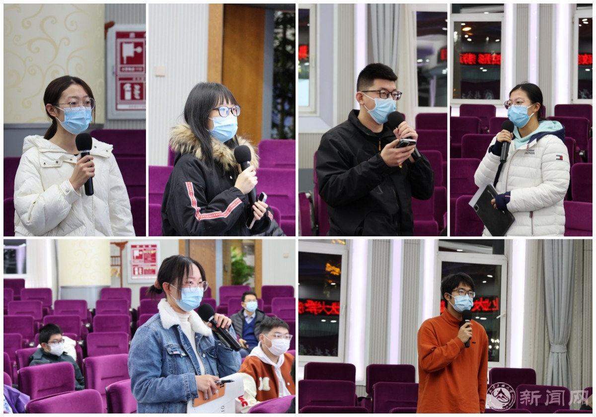 “线上学习如何参加课堂提问和测试环节”“居家复习的毕业班同学如何到校参与研招考试”“若因疫情原因无法按时返校,研究生毕业答辩相关工作如何开展”……参会同学就大家关心的问题积极踊跃进行现场提问。教务处、研究生院、学工部负责人分别就学生集中反映的线上线下教学、期末考试安排、四六级考试、研究生考试、研究生答辩安排等工作进行答疑解惑,分析疫情防控形势,解读疫情防控政策。各学院教学副院长、教务处、研究生院工作人员和同学们共上一堂形势政策课。