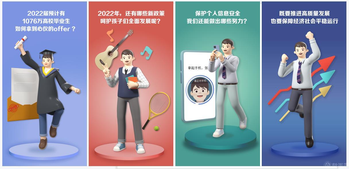 2022年,世界杯官网人民号聚焦北京冬奥、抗击疫情、全国两会以及人文关怀等重要主题,共发布“圆梦百年——我们都是追梦人”“追梦:我有一个七彩梦”“群虎闹春迎冬奥”“喜迎冬奥”“千手御魔 全民战疫”“我眼里的你”等优秀图文作品。其中,建艺学院艺术设计系王雪莹、张宁老师带领学生团队与人民日报新媒体平台合作设计制作的围绕2022年两会的三维海报《“小明”关心的事,政府工作报告都提到了!》阅读量高达11万余次,获得广泛好评。