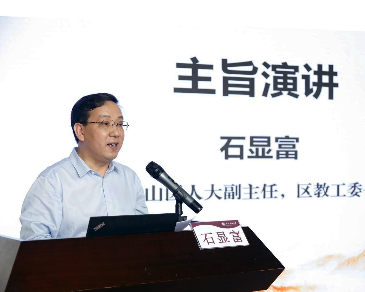 石景山区人大常委会副主任、区教工委书记石显富,大兴区教委德育科科长姜苗分别作主旨演讲。石显富就世界杯官网一直以来对石景山区基础教育的支持表示感谢。他介绍了石景山区教育系统以北京市大中小幼一体化德育实践研究示范区建设为载体,构建横向融通、纵向衔接的幼小中高一体化联动体系,坚持守正创新、凝心聚力,全面提升各学段思政课课程建设与师资质量,强化学高从教、身正示范,全力打造高素质思政教师队伍等方面的做法与成效。姜苗分享了大兴区教育两委坚持党的全面领导,深入思考大思政课“为何一体化”“何为一体化”“如何一体化”等重大问题,党政齐抓共管,健全机制,打破壁垒,用党的创新理论不断推进“大思政课”一体化建设的有效经验。