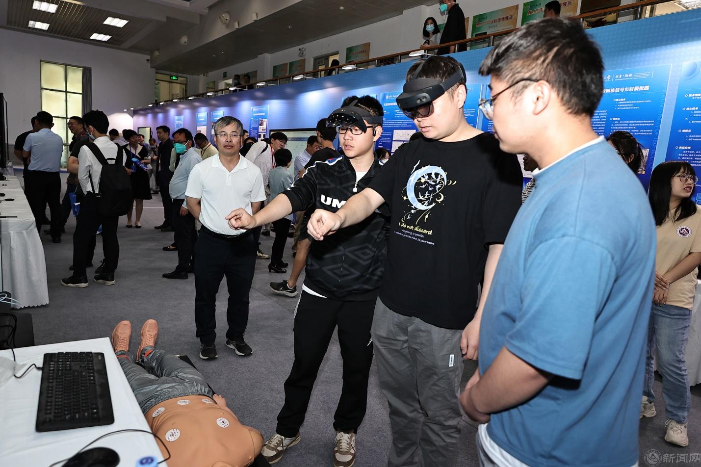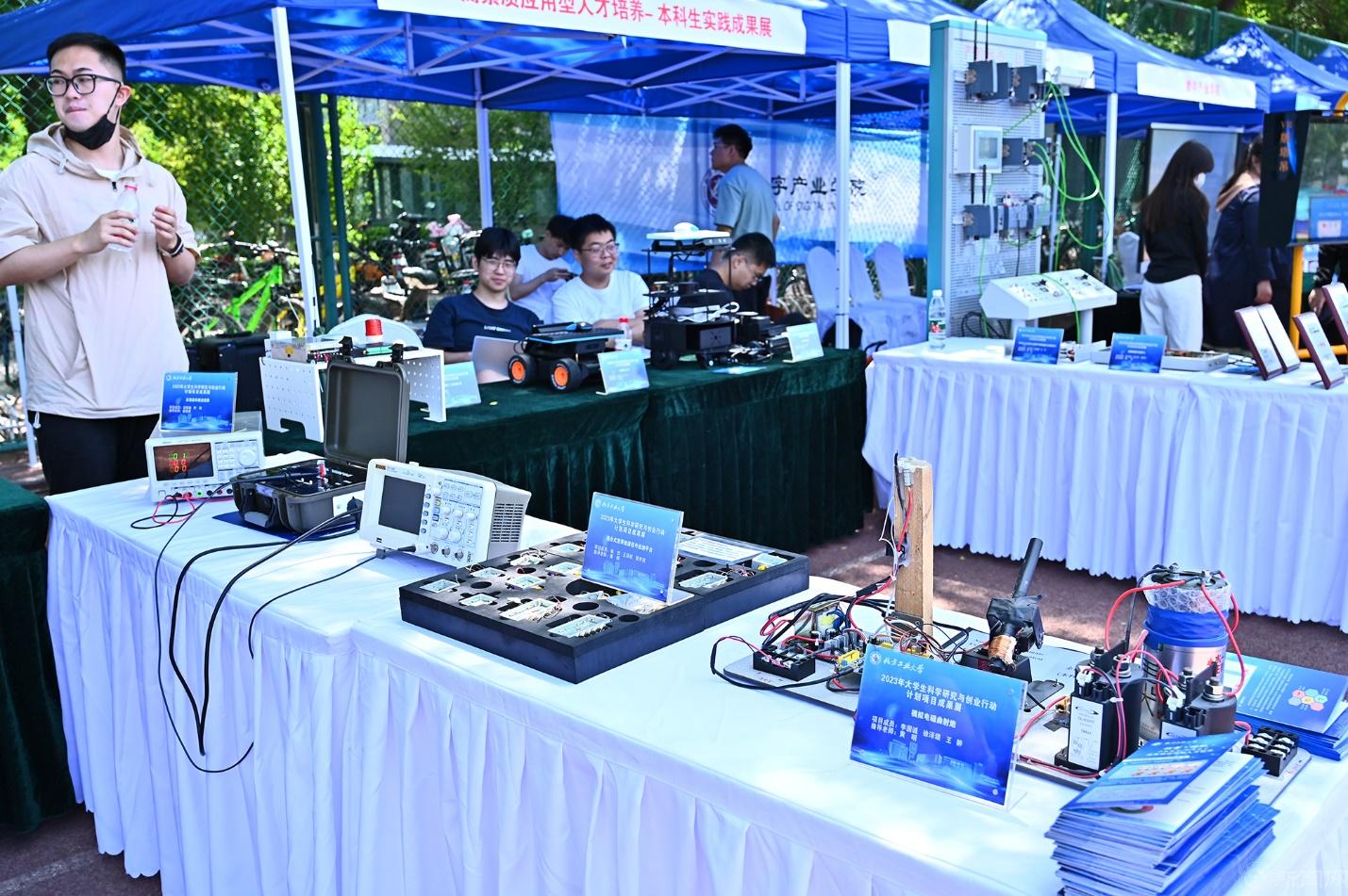 在人才培养成就展示区,通过展板、实物和数字化作品,展示学校数字产业学院面向产业需求,推动跨学科项目制培养的创新实践和专业数字化转型的建设成效;通过“基于信息物理系统的多专业云景融合实验室”,系统呈现学校开展实践教学数智化变革的“新工科”实践活动。