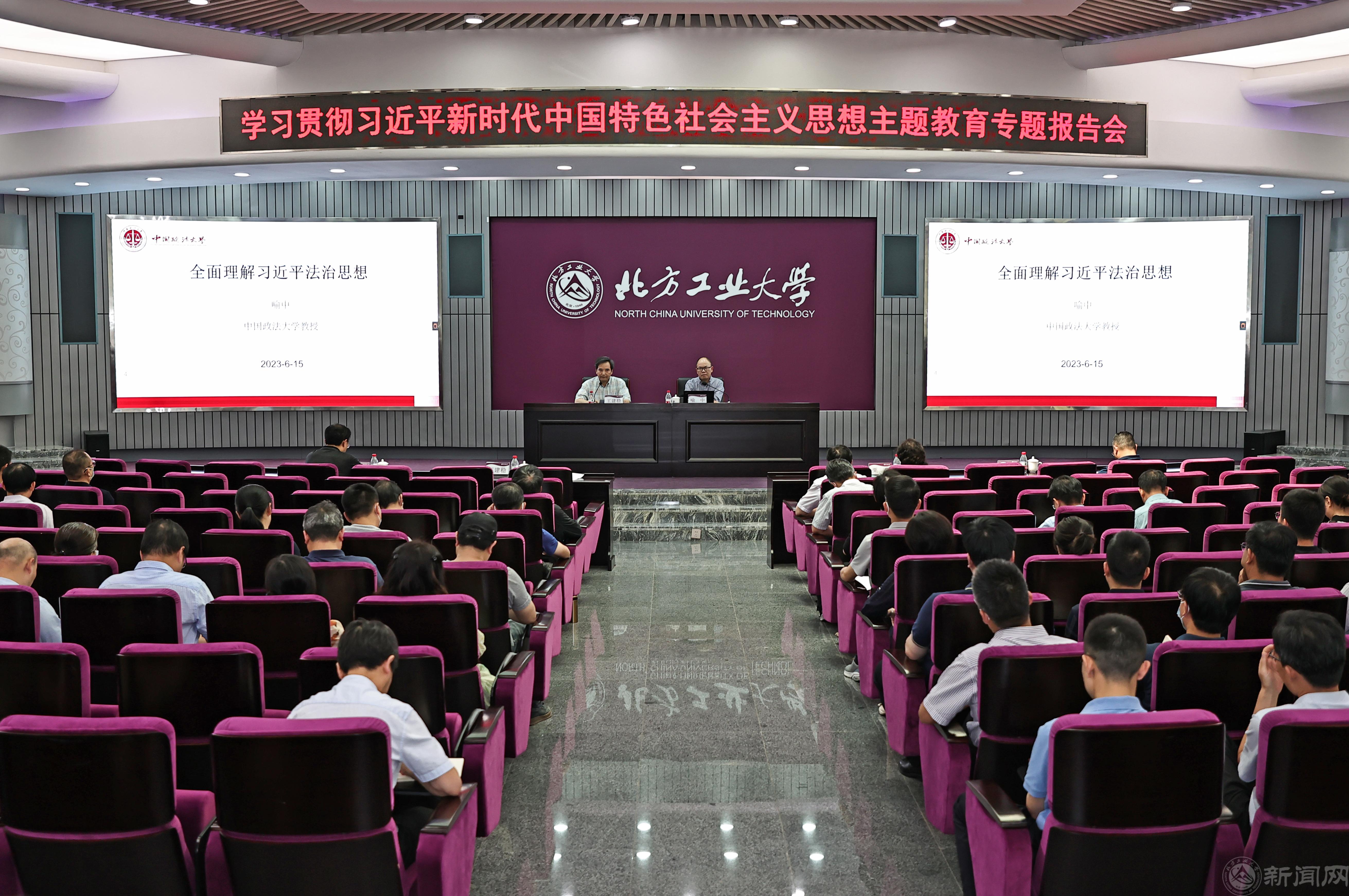 为扎实推进学习贯彻习近平新时代中国特色社会主义思想主题教育,按照学校党委工作安排,学校于6月15日下午举行学习贯彻习近平法治思想专题报告会,邀请中国政法大学习近平法治思想研究院副院长喻中教授做专题辅导报告。全体在校领导出席,学校处级干部、学院党委委员、责任教授、系主任、教工党支部书记、后勤部门经理、机关党员代表和部分学生代表参加学习。报告由党委常委、副校长王建稳主持。