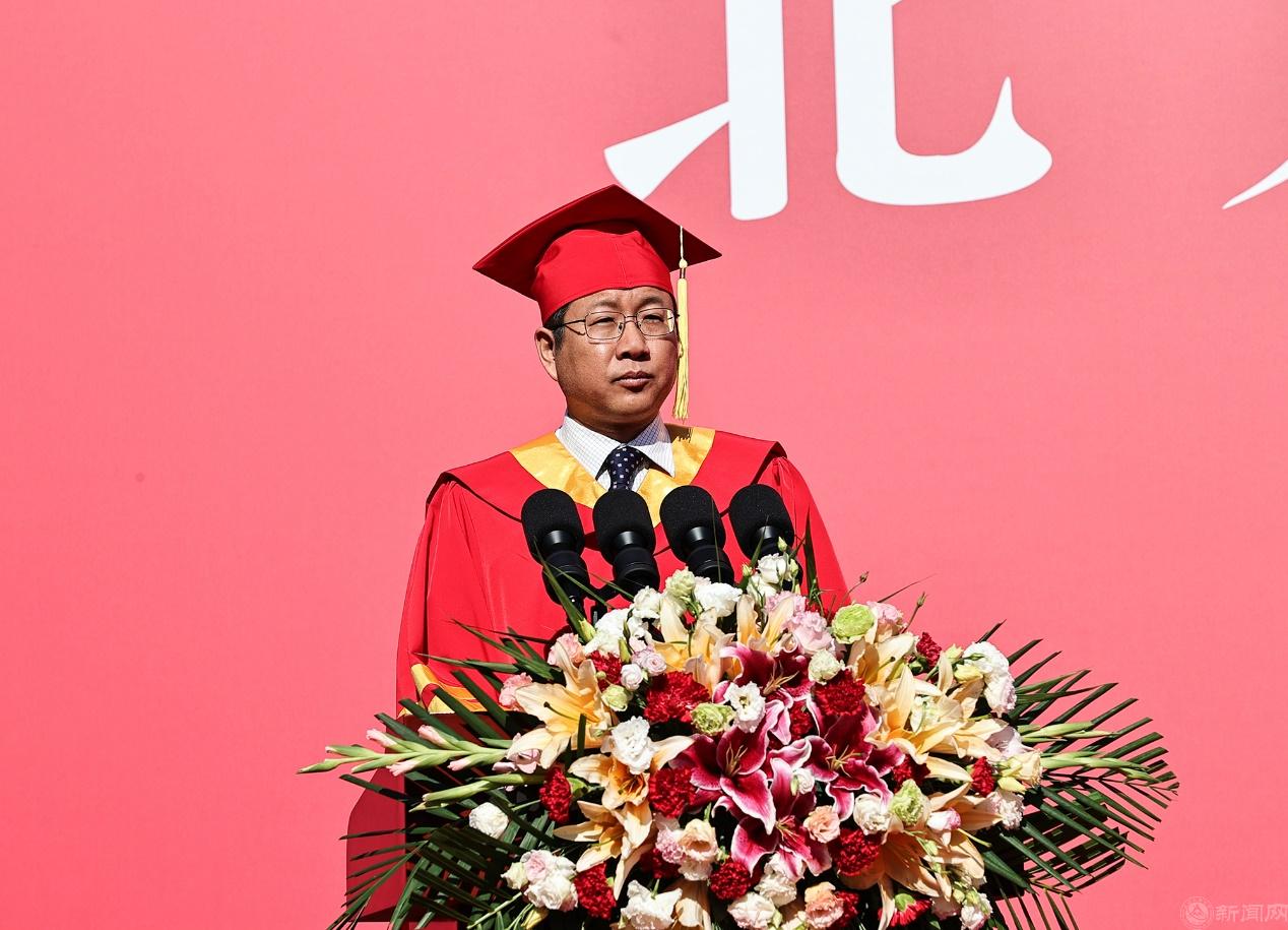 党委副书记、校长张立峰致辞。他祝贺同学们顺利完成学业,开启人生崭新篇章,并为2023届毕业生做最后一次“点名”。他点名典礼当天过生日的同学,祝他们生日快乐;点名疫情防控中不畏艰险勇于奉献的“抗疫先锋”,为他们喝彩;点名在学习、运动、科研各个领域不懈探索勇攀高峰的优秀学子,送出校长的“崇拜”;点名服务冬奥、支教乡村、扎根边疆的同学,向他们致以敬意;点名友通四海、架设国际沟通桥梁的留学生,向他们致以问候……他诚挚地为同学们点赞、加油,希望同学们继续兴趣盎然的与世界交手,一直走在开满鲜花的路上!