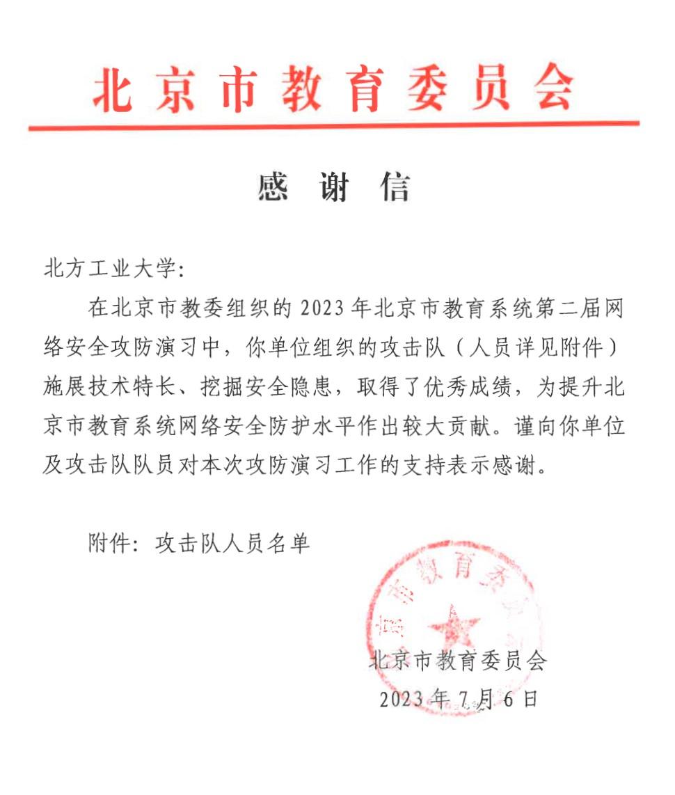 7月6日,世界杯收到北京市教育委员会的感谢信,对网信中心、信息安全专业师生在教育部举办的教育系统网络安全攻防演习中的突出表现给予了高度赞扬。