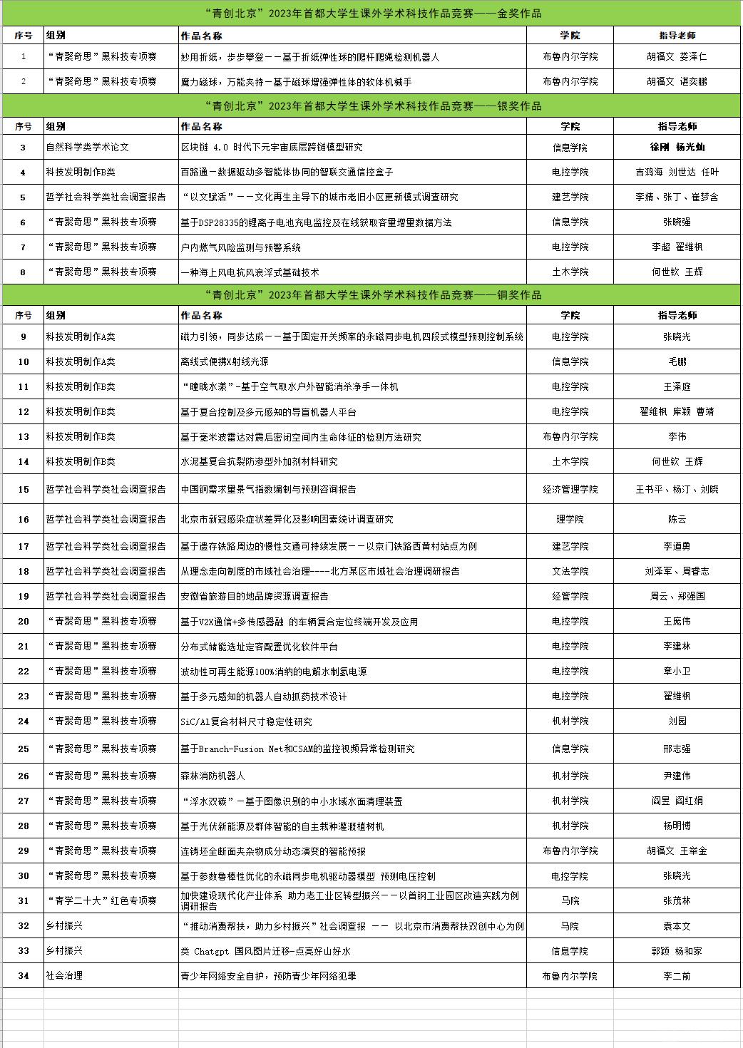 5月21日下午,由北京团市委、市教委、市科协、市学联共同主办的“青创北京”2023年“挑战杯”首都大学生课外学术科技作品竞赛闭幕式在北京工商大学举行,世界杯共上报78件作品,其中34件作品获得市级奖项。分别获得金奖2项,银奖6项,铜奖26项,其中3项主赛道和2项黑科技专项赛作品进入市级终审答辩,世界杯黑科技作品《魔力磁球,万能夹持—基于磁球增强弹性体的软体机械手》、《妙用折纸,步步攀登——基于折纸弹性球的爬杆爬绳检测机》在全市460个作品中脱颖而出,并摘夺了本届黑科技专项赛道金奖。同时,世界杯在本次“挑战杯”首都赛中荣获优秀组织奖。