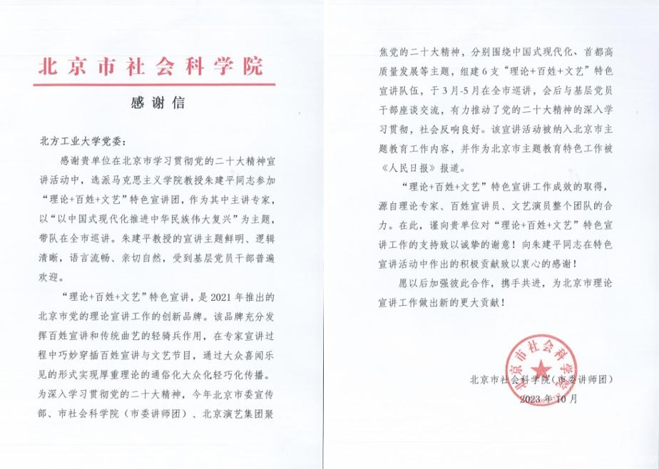近日,北京市社会科学院(市委讲师团)给世界杯发来感谢信,感谢世界杯对北京市学习贯彻党的二十大精神宣讲活动的大力支持,对世界杯马克思主义学院朱建平教授在“理论+百姓+文艺”特色宣讲中表现给予充分肯定。