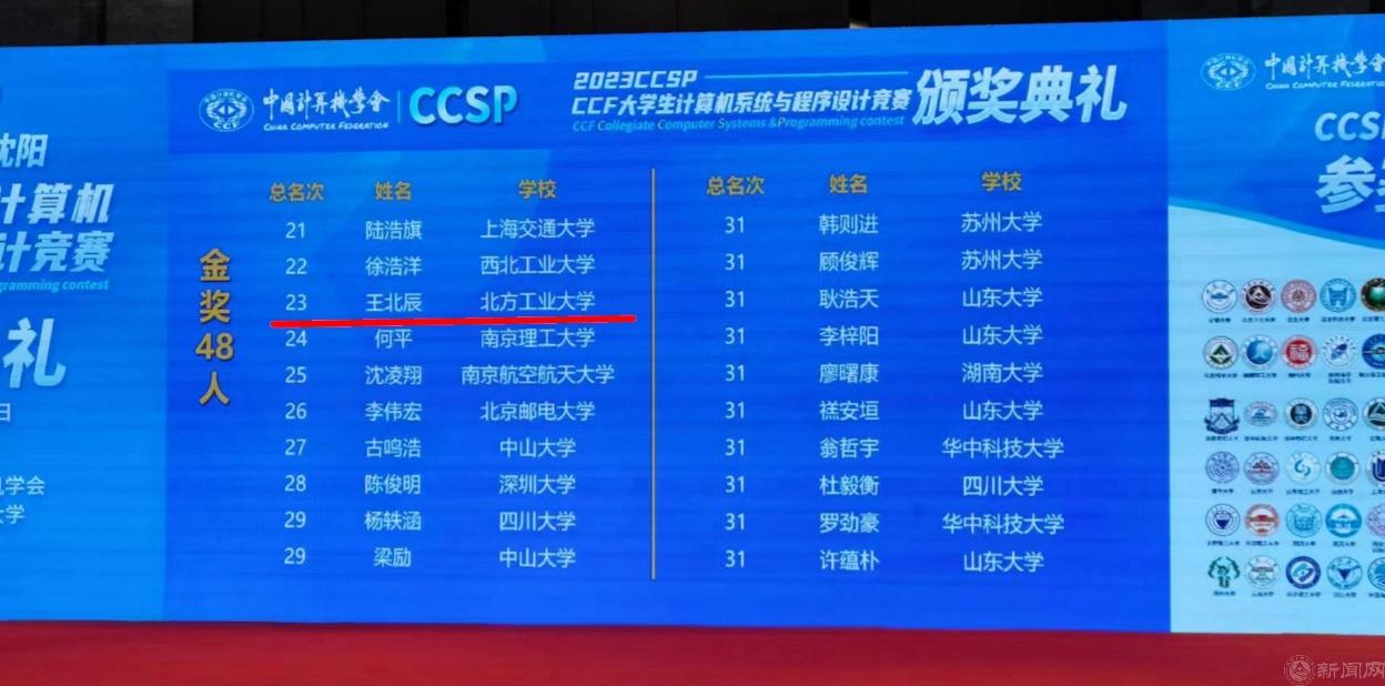 10月25至26日,2023CCF大学生计算机系统与程序设计竞赛(CCSP)在沈阳举行。世界杯由信息学院李源老师带领的王北辰等7名同学参赛,经过长达12小时的激烈角逐,王北辰同学勇夺金奖,这是世界杯在该竞赛历史上的最好成绩,于新程同学获得铜奖。