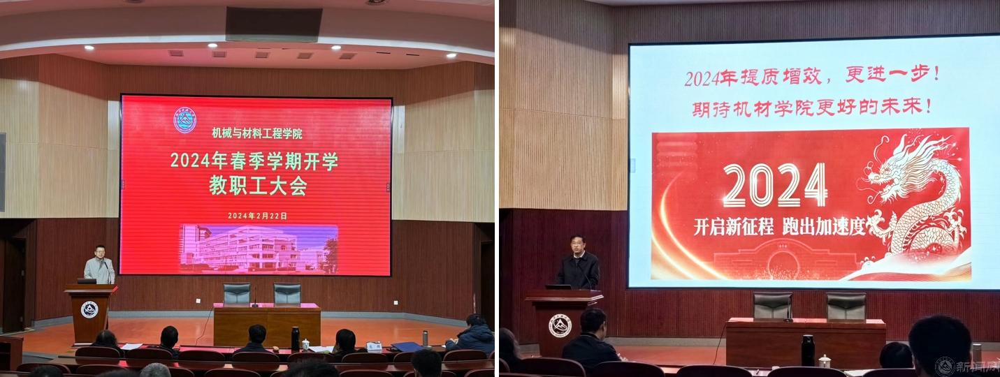 院长刘峰斌总结了上一学年度学院人才培养工作情况、科研与学科建设、国际合作与社会服务、师资队伍建设情况,部署了学院2024年重点工作。他要求全院在2024年工作中,以博士点建设为重要抓手,对标对表,全力提升人才培养质量、学科建设水平、科研成效,为学校重大任务、重点工作贡献力量。学院党委书记王文革总结了学院2023年党建工作,指出了学院工作存在的短板、面临的挑战。他强调学院要按照学校党委的要求,认真思考“样板建设,学院何为”,奋力推进学校“五大创新工程”,以真抓实干推动工作落到实处,为高水平应用型大学样板建设贡献机材学院力量。