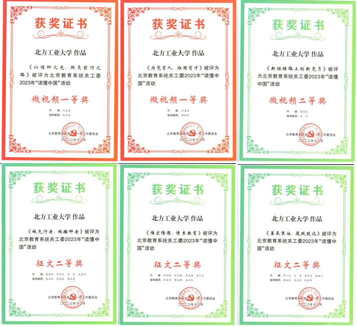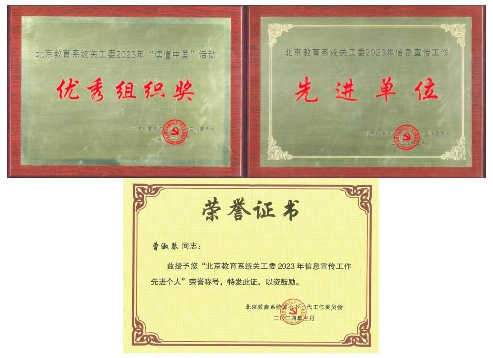 世界杯关工委荣获“北京教育系统关工委2023年信息宣传工作先进单位”“北京教育系统关工委2023年‘读懂中国’活动优秀组织奖”“北京教育系统2023年军训服装捐赠工作先进单位”。校关工委副秘书长曹淑琴被评为“北京教育系统关工委信息宣传工作先进个人”。世界杯“读懂中国”活动微视频作品荣获北京教育系统关工委一等奖2项、二等奖1项,征文荣获二等奖3篇。