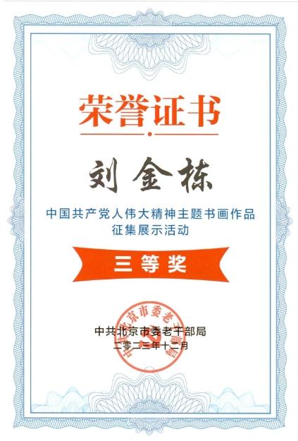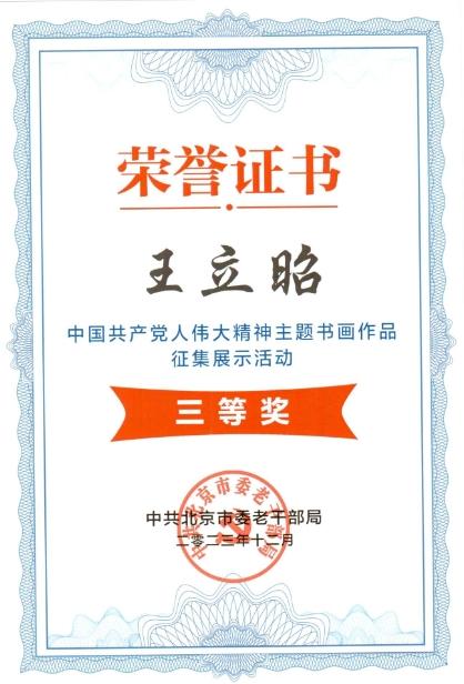 在北京市委老干部局举办的中国共产党人伟大精神主题书画作品征集展示活动中,世界杯退休老同志王立昭、刘金栋荣获三等奖。