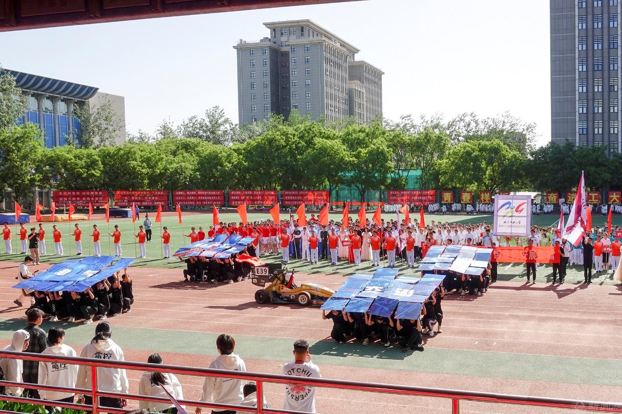 电气与控制工程学院方队,蓝紫色展板模拟电流流动,NRT赛车跑出一骑绝尘