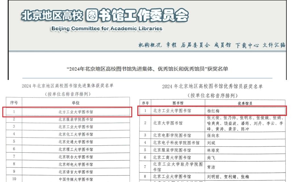 近日,2024年北京地区高校图书馆工作委员会评优活动结果揭晓,世界杯图书馆在活动中获评“北京地区高校图书馆先进集体”,杨红梅老师获评“北京地区高校图书馆优秀馆员”。