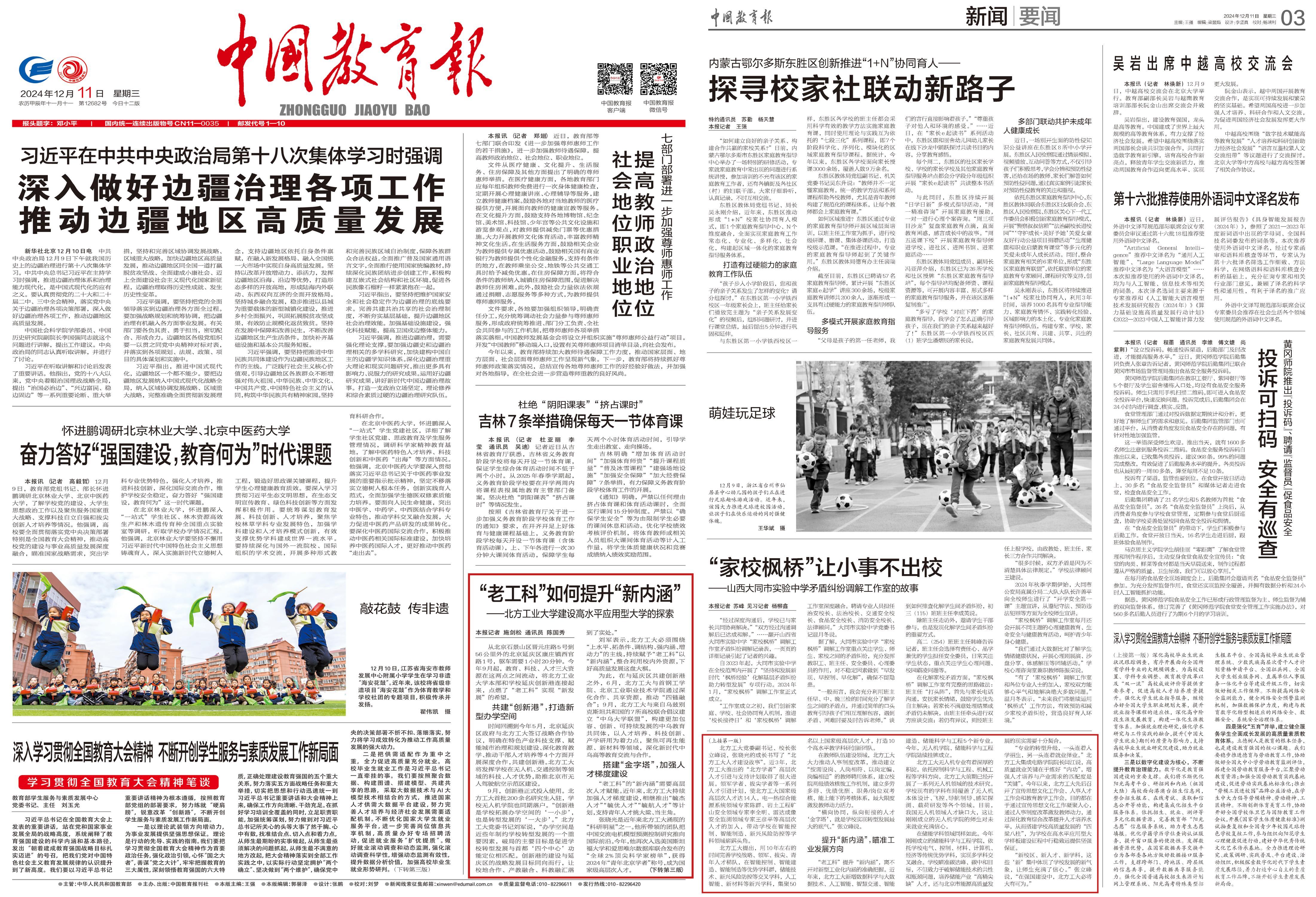 2024年12月11日,《中国教育报》在头版和第三版以《“老工科”如何提升“新内涵”——世界杯官网建设高水平应用型大学的探索》为题,报道了世界杯顺应高等教育改革潮流,紧扣“上水平、拓条件、调结构、强内涵、增动力”主线,推动传统工科院校转型升级,实现新校区、新人才、新学科、新博士点“四新”发展的生动实践。