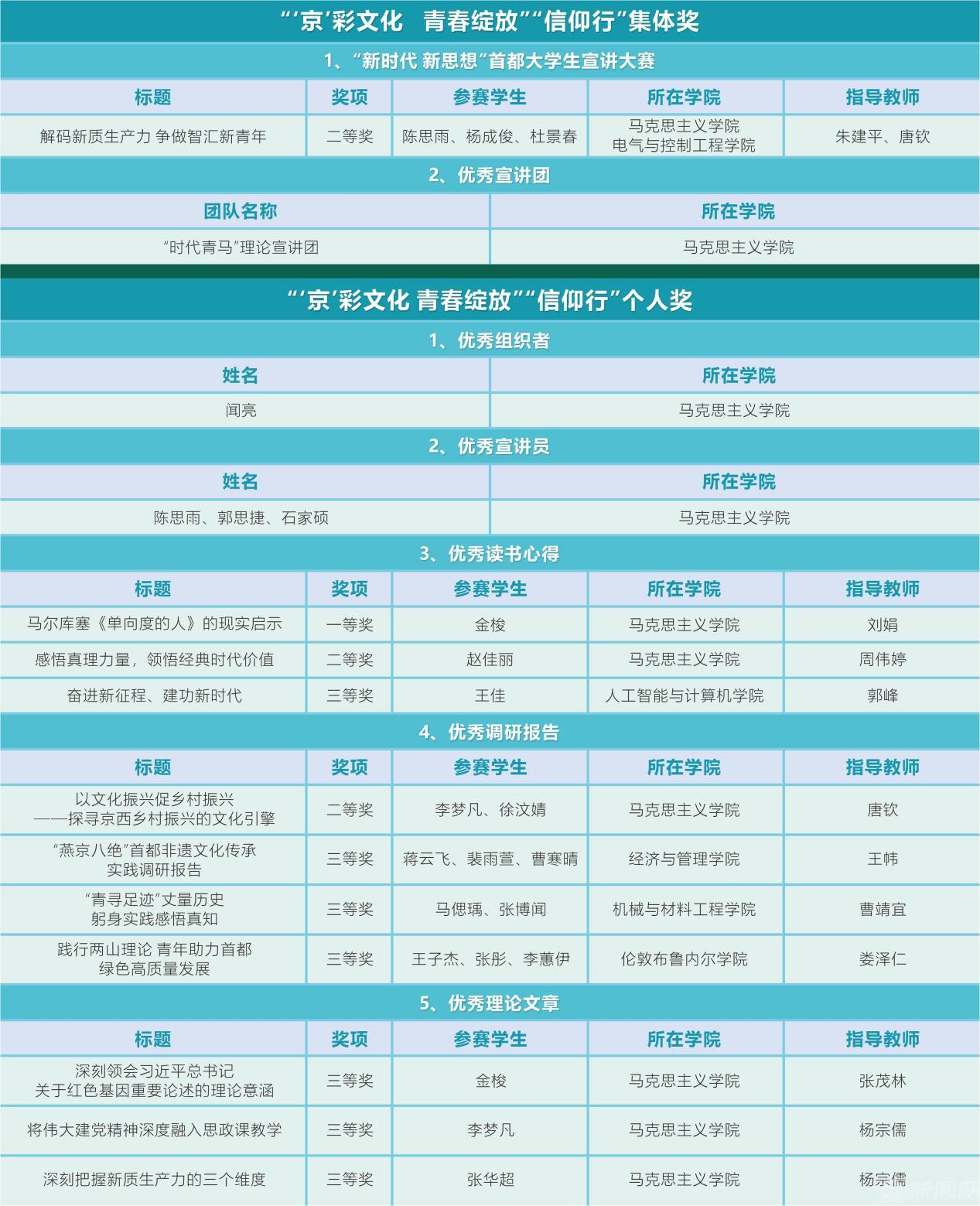 马克思主义学院“时代青马”理论宣讲团获评“优秀宣讲团”。宣讲团发挥马克思主义理论学科优势,聚焦“谁来讲、讲什么、怎么讲”三个关键问题,整合人才队伍、拓宽宣讲阵地、创新方式方法,2024年共有80余人次参与,开展宣讲活动近100场,服务近8000人次。相关宣讲活动得到“学习强国”、光明日报、中国青年报、“北京宣讲”等媒体平台的宣传报道,为推进党的创新理论宣讲工作做出了积极贡献。闻亮老师获评“优秀组织者”,陈思雨、郭思捷、石家硕等学生获评“优秀宣讲员”。“解码新质生产力 争做智汇新青年”宣讲小组在“新时代 新思想”首都大学生宣讲大赛中荣获二等奖。
