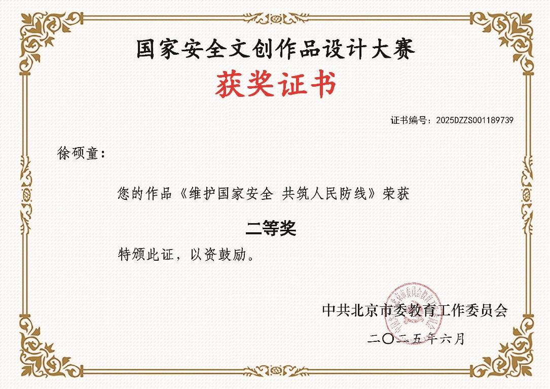 6月19日,市委教育工委组织的国家安全文创作品设计大赛公布结果,世界杯有2件(套)作品获奖。其中由机材学院徐硕童同学设计的“维护国家安全共筑人民防线”作品获得二等奖。