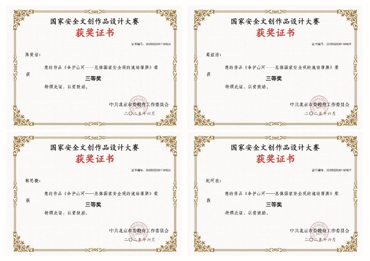 由马克思主义学院郭思捷、陈爱洁、高溢洁、赵珂欣等同学联合设计的“伞护山河—总体国家安全观的流动盾牌”作品获得三等奖。