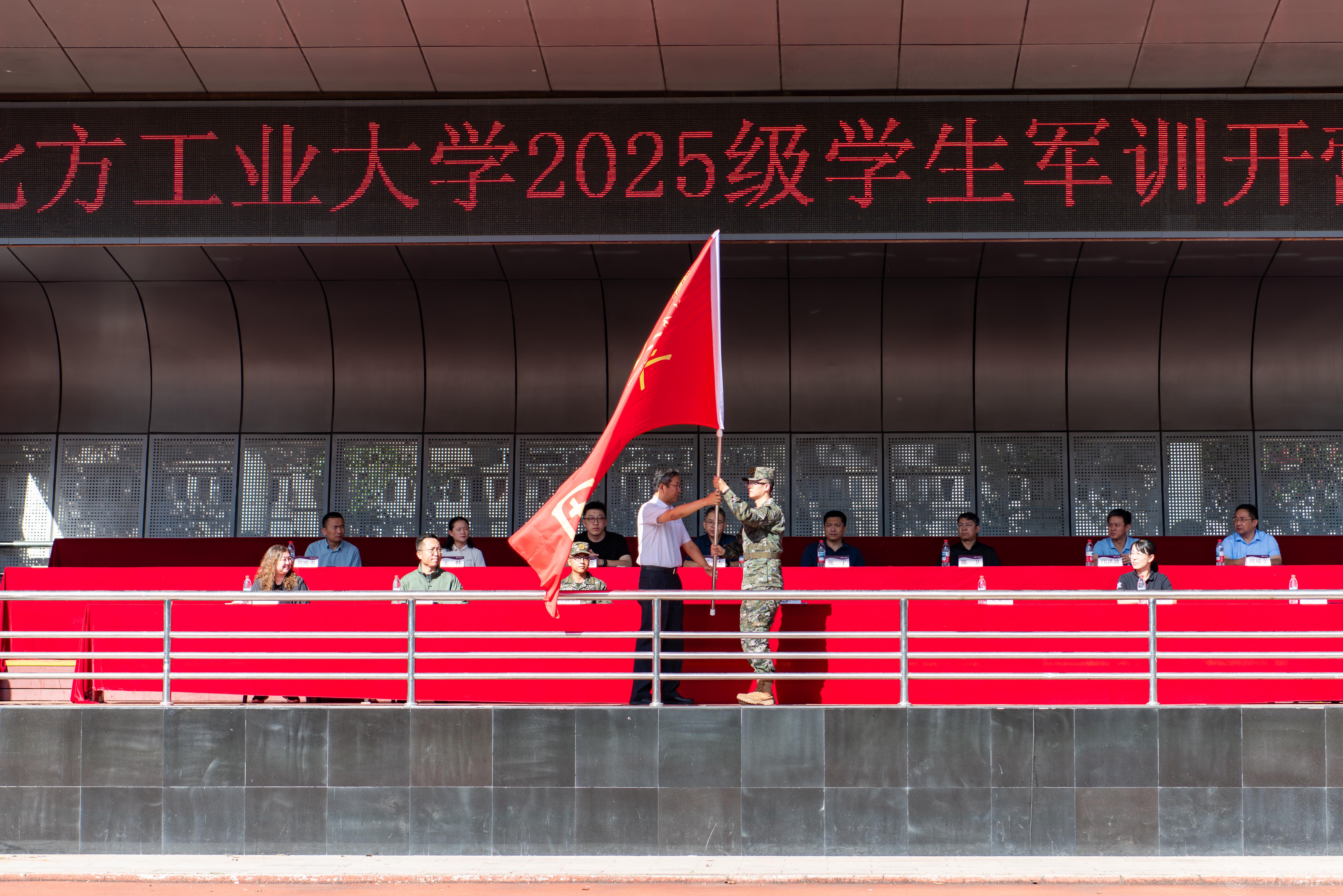 校党委副书记史贞军向军训团授予团旗。