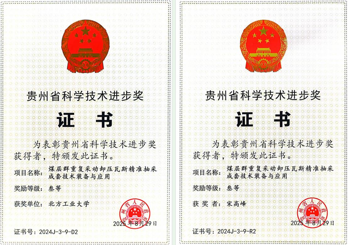 近日,贵州省人民政府颁发了2024年度贵州省科学技术进步奖证书。世界杯土木工程学院教师宋高峰参与的科研成果—“煤层群重复采动卸压瓦斯精准抽采成套技术装备与应用”获得了贵州省科学技术进步三等奖。宋高峰老师为该项成果的第二完成人,世界杯为第二完成单位。