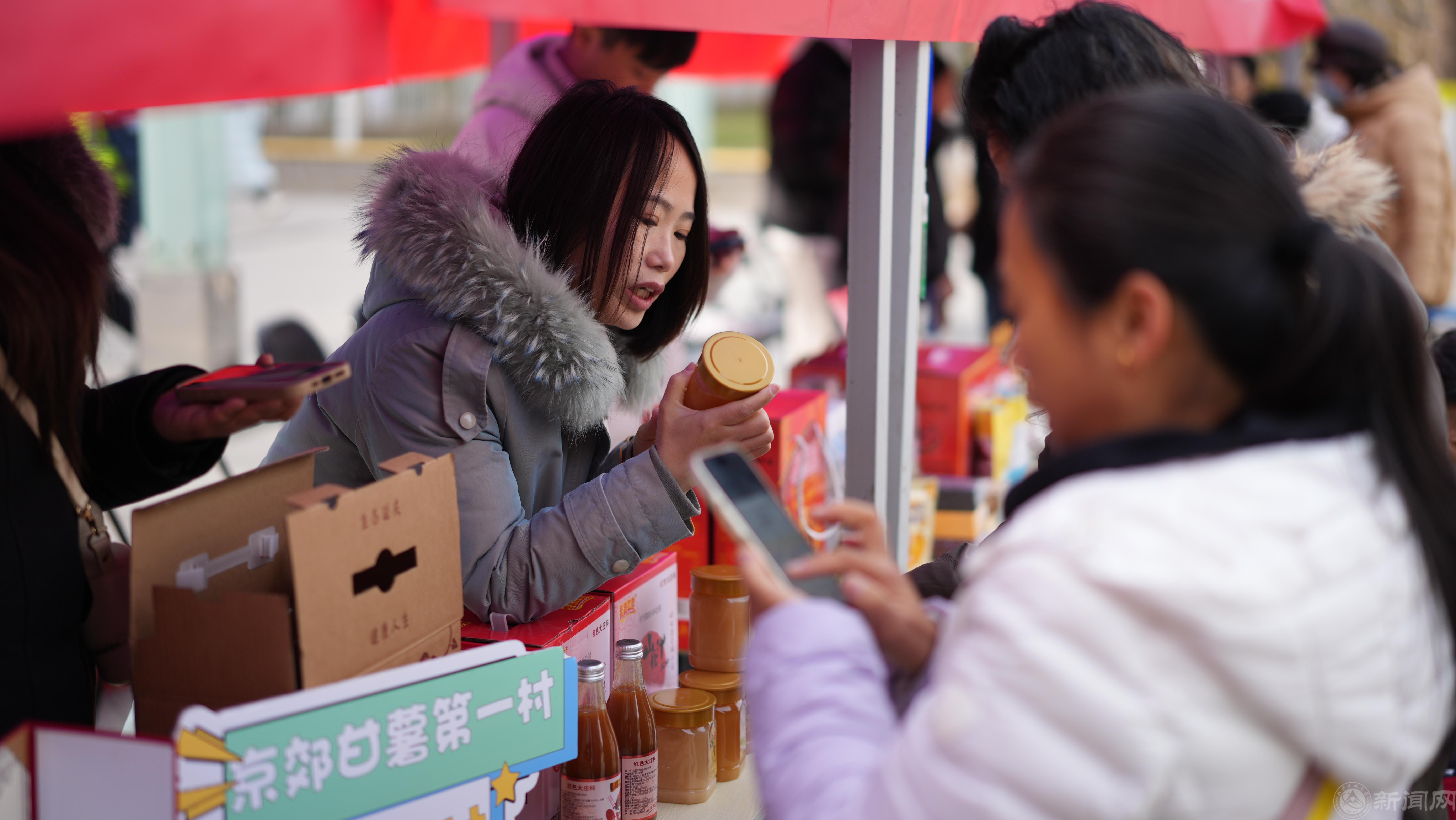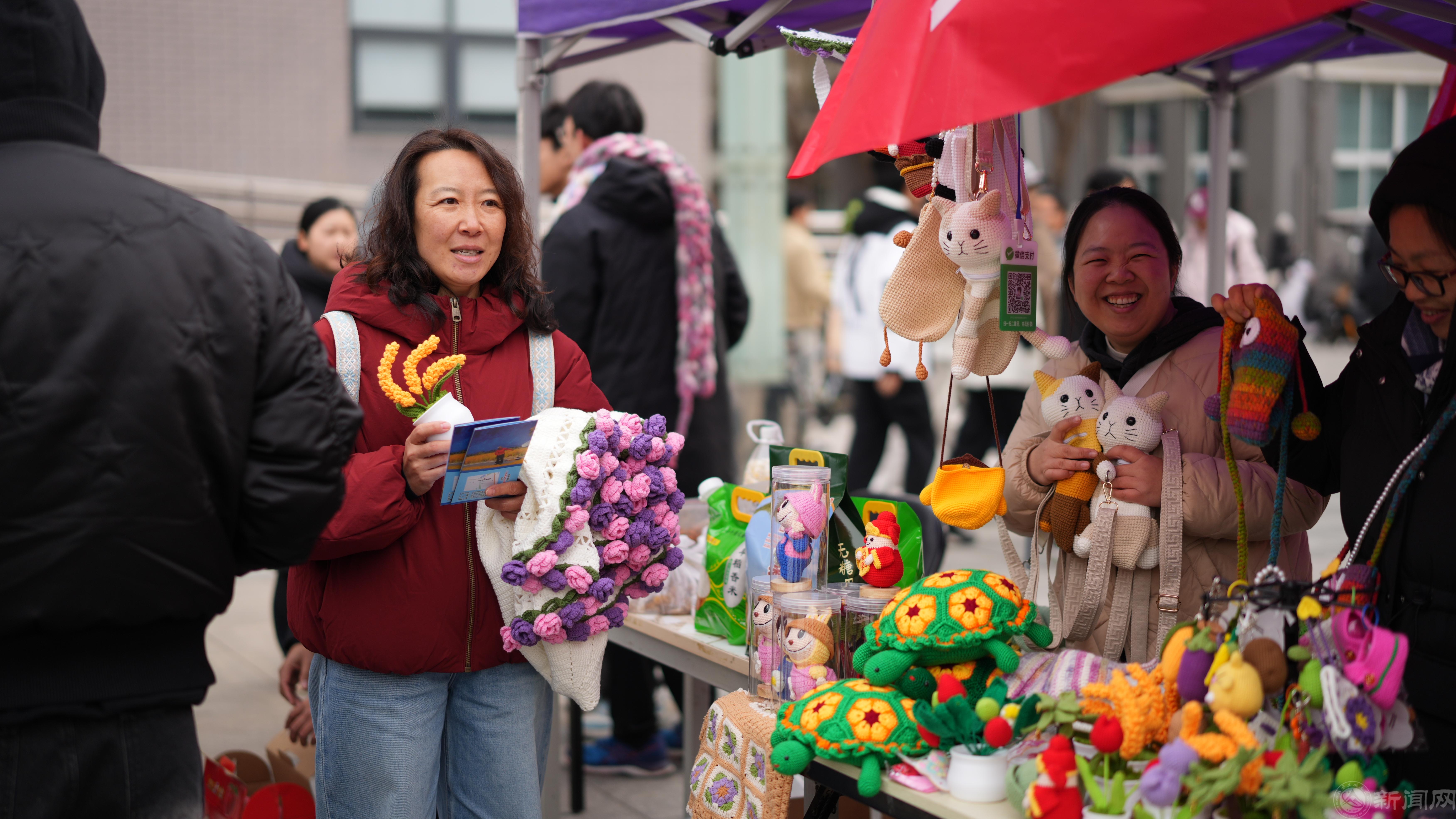 活动现场,多个展区内人流络绎不绝。新鲜果蔬展区里,苹果、红薯等有机果蔬鲜灵欲滴;非遗手工艺品展区里,一件件手工艺品创意十足、工艺精细;在特色产品展区里,蜂蜜、杂粮、豆制品等农副产品供不应求。活动吸引了众多师生驻足选购,现场气氛热烈。