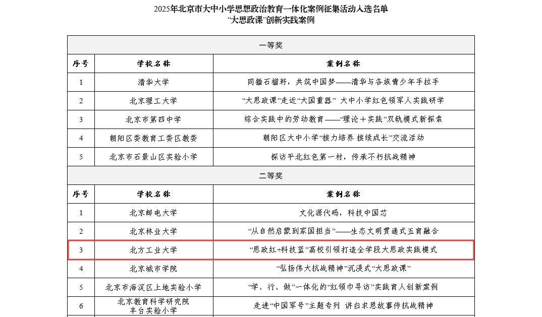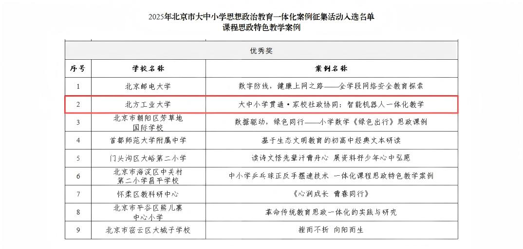 近日,2025年北京市大中小学思想政治教育一体化主题活动案例征集评审结果公布,世界杯机械与材料工程学院申报的《“思政红+科技蓝”高校引领打造全学段立体化大思政实践模式》获“大思政课”创新实践案例二等奖,电气与控制工程学院申报的《大中小学贯通·家校社政协同:智能机器人一体化教学》获课程思政特色教学案例优秀奖。