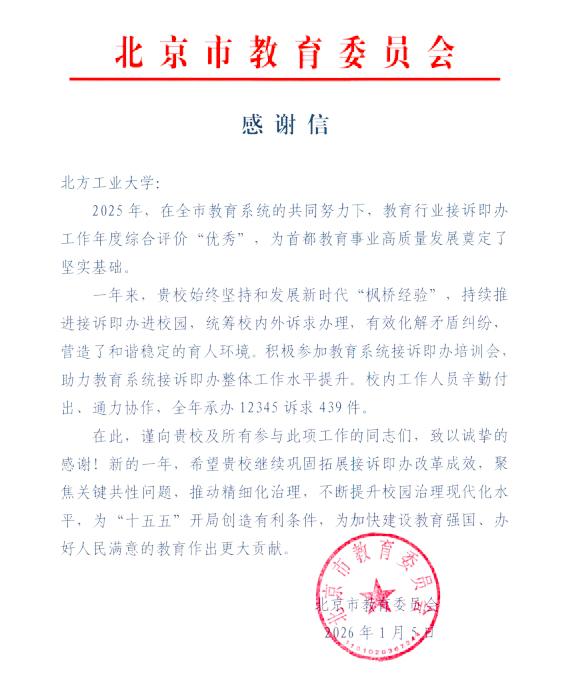 近日,北京市教委向世界杯发来感谢信,对世界杯在2025年度“接诉即办”工作中取得的显著成效与积极贡献予以充分肯定。在全市教育系统年度综合评价中,世界杯接诉即办工作获评“优秀”。