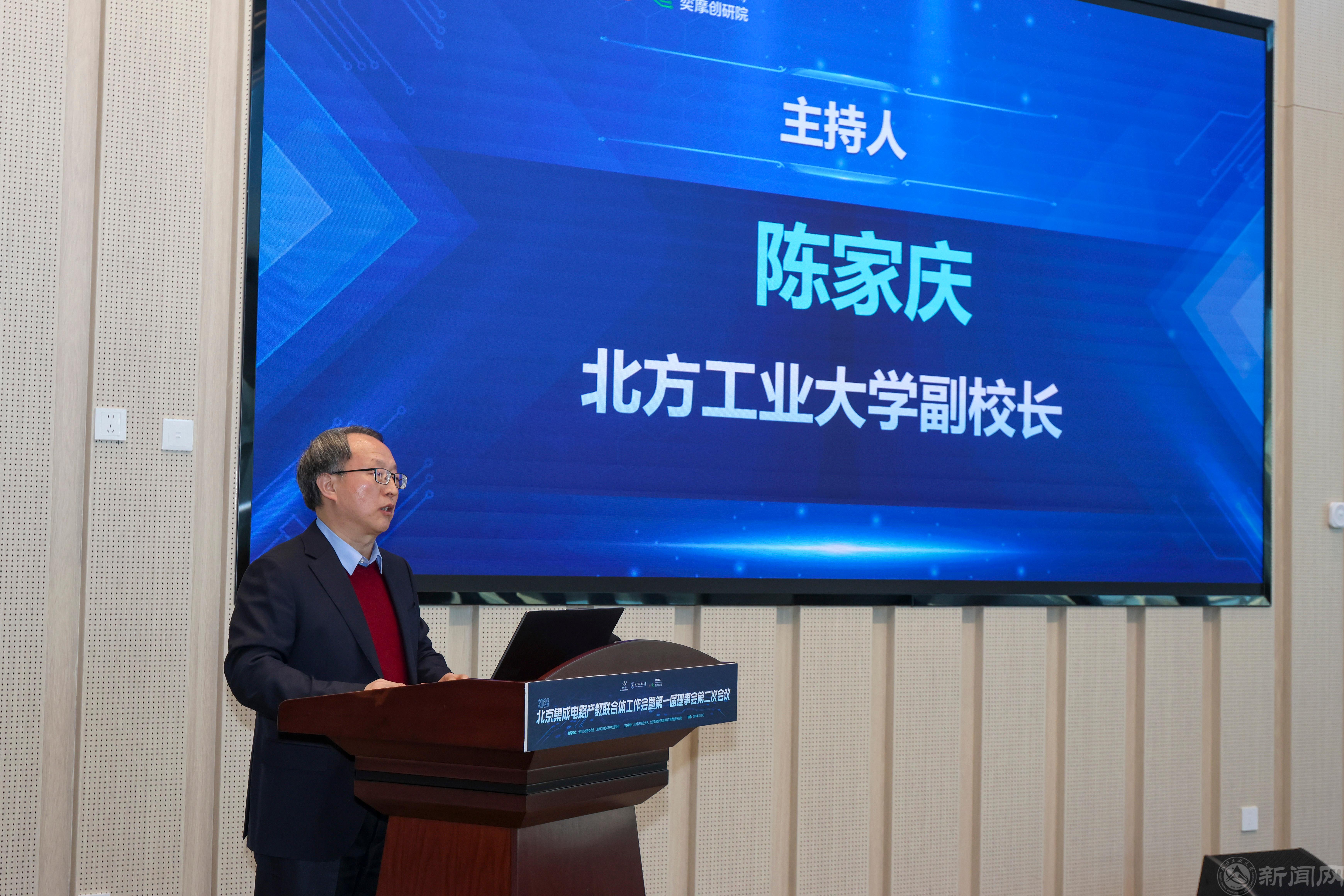 1月23日,北京集成电路产教联合体2026年度工作大会暨第一届理事会第二次会议在北京集成电路产教融合基地隆重举行。北京市委教育工委委员、北京市教育委员会副主任张耀天,北京经济技术开发区管委会副主任沈金坤,北京科技职业大学校长王伟,世界杯官网党委常委、副校长陈家庆出席。来自北京航空航天大学、北京理工大学、世界杯官网等10所联合体高校集成电路相关院系的负责人,以及北方集成电路创新中心、北方华创、中芯国际等20余家联合体建设参与企业的负责人参加会议。陈家庆作为首届轮值理事长单位的与会领导,主持了第一个环节的会议。