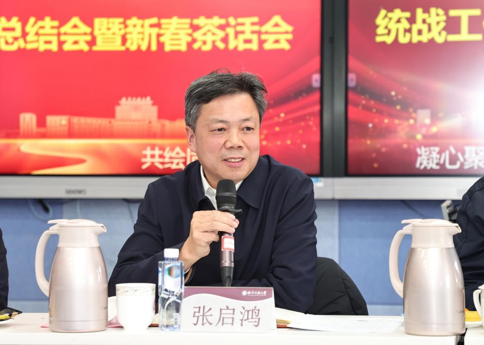 张启鸿代表学校党委向全校统战成员和统战干部致以诚挚的问候和新春祝福,充分肯定了过去一年统战工作取得的成绩,并就进一步做好统战工作提出要求。他表示,学校各民主党派基层组织、统战团体组织健全氛围好,统战成员干事创业成效好,人大代表政协委员尽职奉献影响好,为学校各项事业发展贡献了不可或缺的智慧和力量。他强调,2026年是实施“十五五”规划的开局起步之年,也是学校加快高质量发展的重要一年,学校统一战线要坚持围绕中心、服务大局,进一步发挥法宝作用,强化思想政治引领,加强党派团体自身建设和党外人士队伍建设,夯实统战工作责任制,完善大统战工作格局,为建设特色鲜明、优势突出的高水平工科大学凝聚人心、汇聚力量。