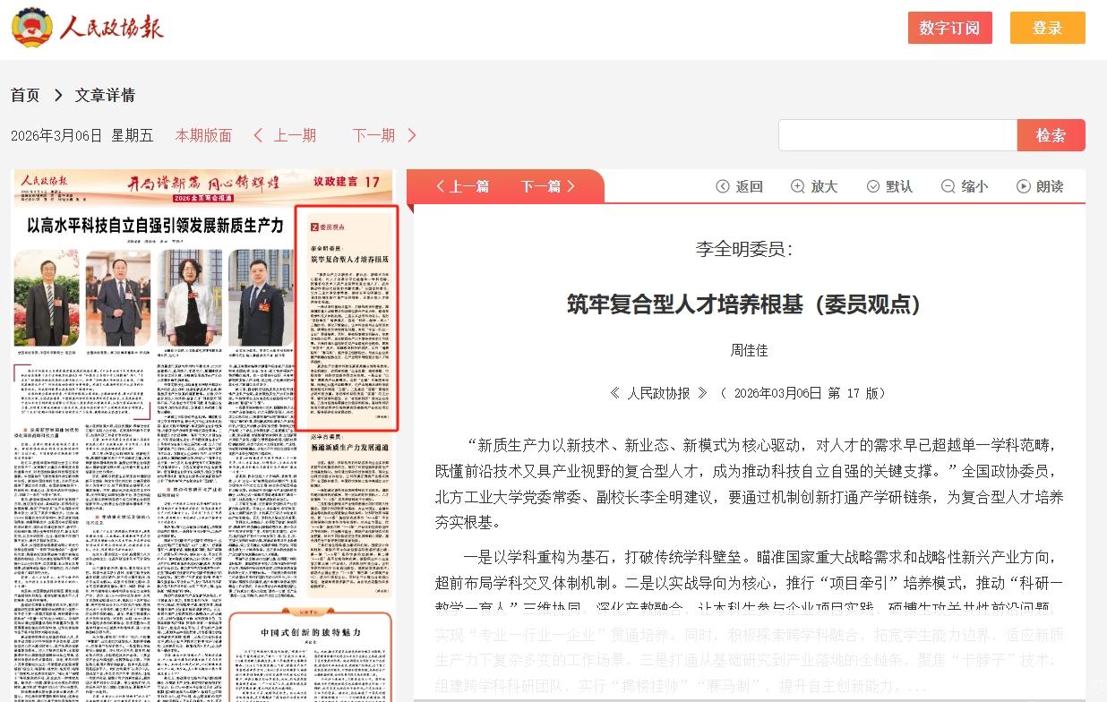 凭借扎实的专业研究和丰富的履职思考,李全明教授先后接受人民政协报、中国应急管理报、中国煤炭报、国家电网报、中国黄金报、中国能源观察等多家媒体采访报道,围绕复合型人才培养、创新驱动发展战略实施、电网韧性提升、矿山智能化开采、安全生产底线坚守等热点议题发表委员观点,发出北方工大声音。 此前,李全明教授的履职故事被中华人民共和国应急管理部专题报道,其推动安全领域法规完善、加大资源投入,筑牢公共安全基石的实践与思考,成为政协委员扎根领域、履职为民的生动范例。理论文章《实施创新驱动战略是中央企业的使命担当》在《中国石化》头版刊发,从中央企业发展视角为实施创新驱动战略提出见解,彰显了深厚的理论功底和行业视野。