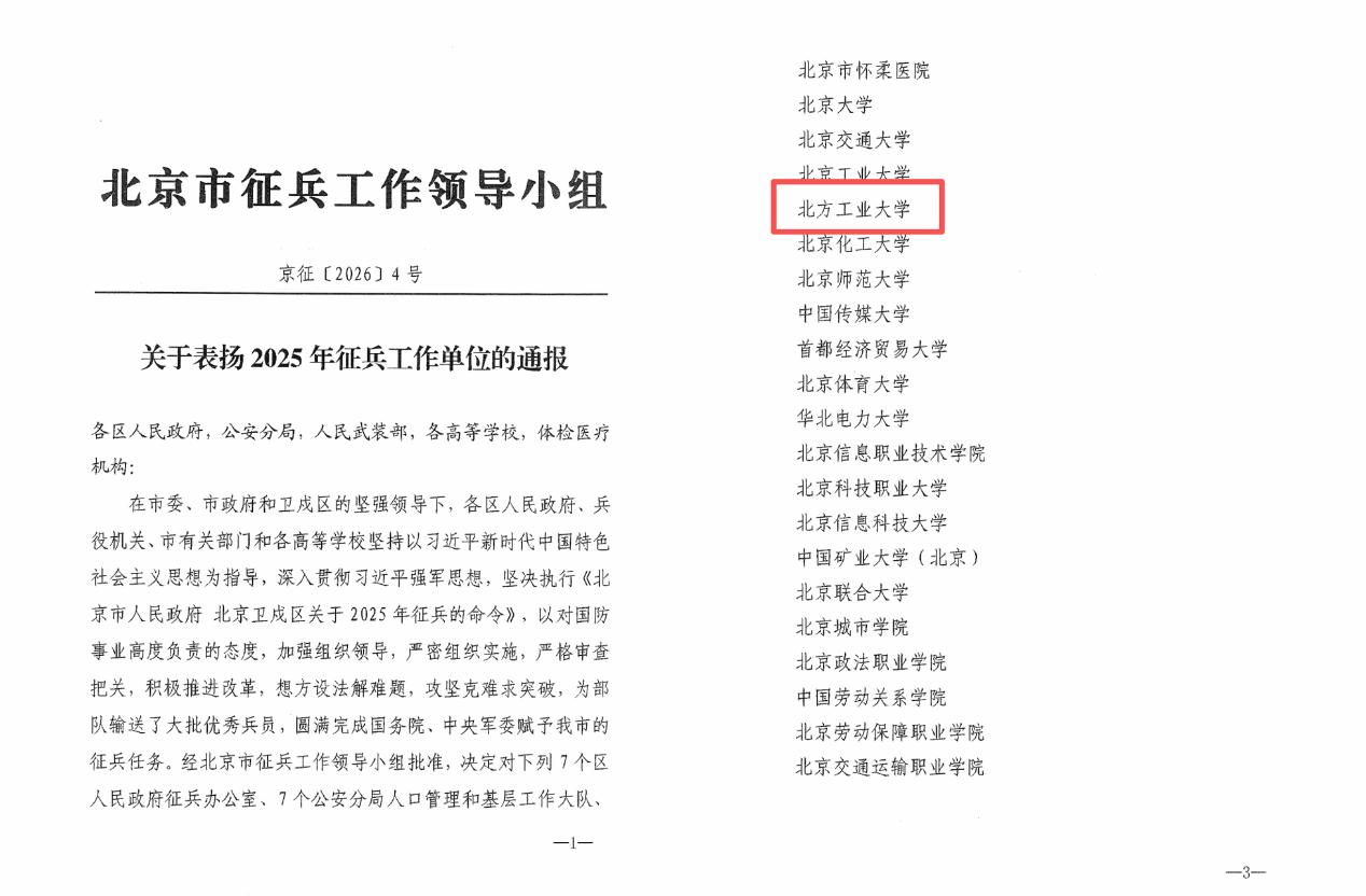 近日,北京市征兵工作领导小组印发《关于表扬2025年征兵工作单位的通报》,对7个区人民政府征兵办公室、7个公安分局人口管理和基层工作大队、7个征兵体检医疗机构和20所高校予以通报表扬。世界杯获评北京市2025年征兵工作先进单位,这是连续第七年获此荣誉,充分彰显了学校国防育人的深厚积淀和征兵工作的扎实成效。