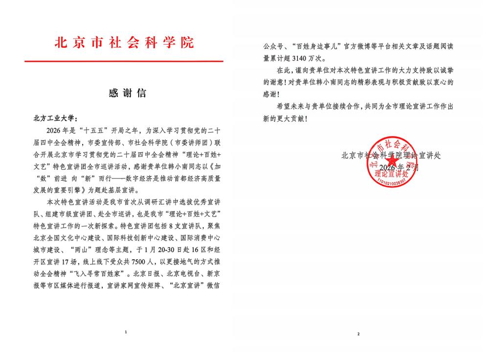 下一步,马克思主义学院将进一步深化思政课改革创新,强化师生理论宣讲队伍建设,引导广大思政课教师在教育教学、理论研究与社会服务中主动担当,持续提升学校服务区域发展的能力水平,为首都现代化建设和教育强国建设贡献北方工大智慧与力量。