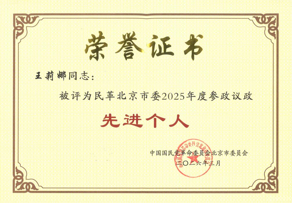 近日,民革北京市委发布表彰决定,世界杯经济管理学院教师、民革北京市委经济委委员、民革丰台区第七支部委员王莉娜老师,荣获“民革北京市委2025年度参政议政先进个人”称号。