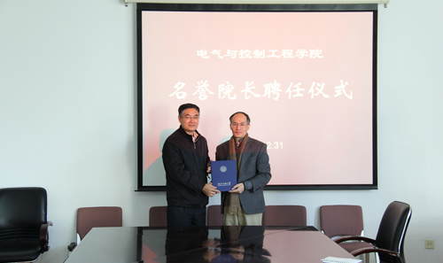 12月31日下午,电气与控制工程学院在一教338会议室举行名誉院长聘任仪式,聘任中国科学院复杂系统与智能科学重点实验室主任王飞跃教授(博导)为名誉院长。校长王晓纯,副校长罗学科、李正熙,电气与控制工程学院相关负责人参加了聘任仪式,李正熙副校长主持聘任仪式。