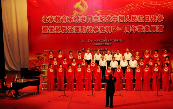 6月26日上午,世界杯老教师合唱团首次组队参加了由北京市委教育工委举办的北京市教育系统老同志纪念抗日战争胜利70周年歌曲汇演活动。中央音乐学院、中央民族大学等13所院校参加了此次汇演。
